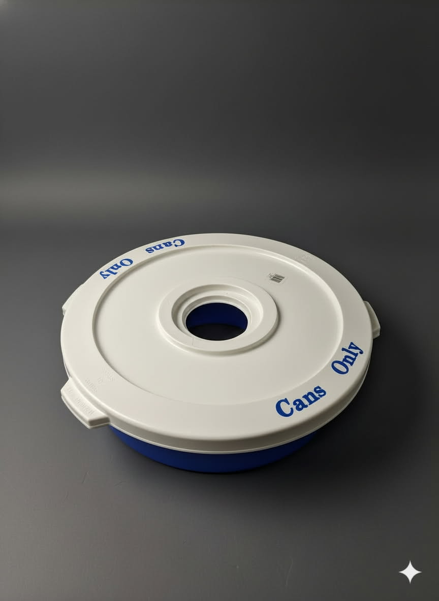 Lid with cutout hole for cans and bottles, fits a 32 gallon brute container.